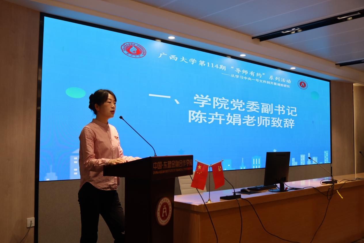 院党委副书记陈卉娟开场致辞,她表示,此次活动能够进一步推动主题教育走深走实,搭建师生学术交流的平台,构建师生之间良好的导学关系,充分发挥导师在学生教育培养中的引路人作用,也期待同学们可以通过近距离感受学者风范,领悟人生智慧,拓宽学习边界,提升人文素养。