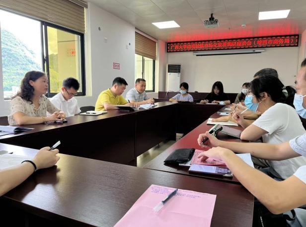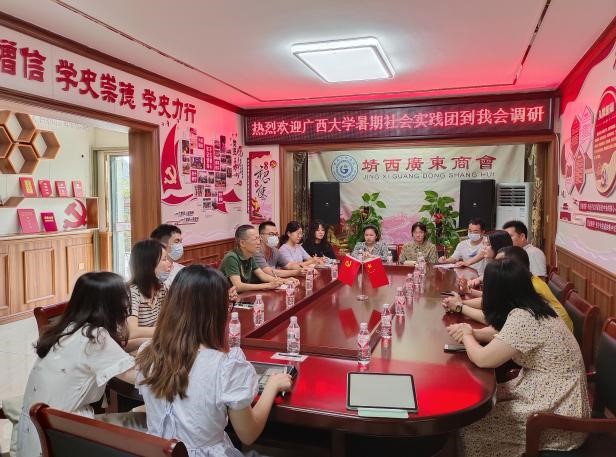 实践团师生还与当地商务局、广东商会取得联系。在7月15日上午,实践团在商务局7楼会议室举行座谈会,商务局三位局长及两位主任出席会议。在会上商务局赵局长为同学们讲解了当前靖西市经济发展现状及未来发展规划,表明靖西商贸未来发展将与电商结合,实现线上线下多渠道购销。但就目前情况而言,要发展还存在人才匮乏的问题,今后将把重点放在培养、发掘当地人才上。在自由提问环节实践团成员向各位领导询问了如何刺激靖西市消费、如何帮扶当地企业度过疫情难关等问题,主管内贸和市场建设的彭主任就提出的问题为同学们讲述了当前靖西市市场体系建设遇到的困难、未来破局方向以及当地针对疫情能够给予企业的支持政策。商务局的领导们都表示,在疫情下,当地的经济受到强烈冲击,但政府会尽力帮助当地大小企业度过难关。下午,实践团前往靖西市广东商会,商会执行会长李丽君,常务副会长张喜见等六位重要领导出席了座谈。在座谈中,李会长简要介绍了商会的自身建设、开展公益行动方面等基本情况。随后,参加座谈的商会领导介绍了自身企业的基本情况、企业优势、企业前景、环境优势以及发展中遇到的问题等,并就实践团成员关注的大陆博彩平台、就业环境、就业待遇、人才需求情况等问题给予了深入细致的回答。
