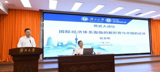 主旨报告环节,钱克明主任主要围绕全球化发展轨迹与国际经济体系演变规律、中国在当前形势下的战略选择两大方面内容同在场师生展开了分享。首先,钱克明主任介绍了国际经济体系是国家或地区之间的经济活动相互联系、相互依赖、相互竞争、相互影响形成的一个有机整体,其中包括国际经济主体、国际经济治理、国际经济格局、国际经济秩序四个要素。