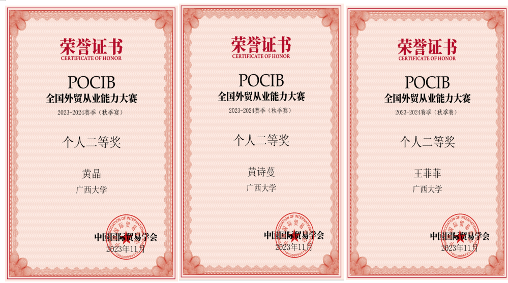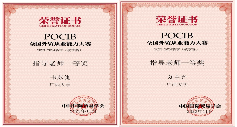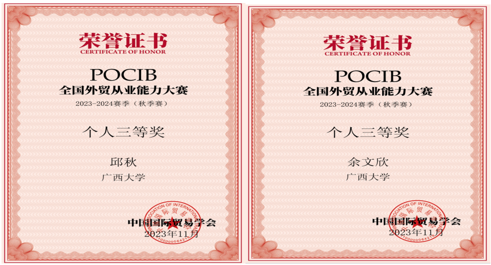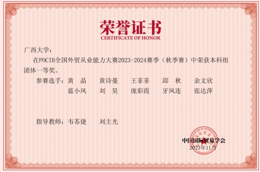 10名国贸系学生组成的代表队参加了POCIB全国外贸从业能力大赛2023-2024赛季(秋季赛)。该项大赛赛前经过一个月的预选和准备阶段,正式比赛历时13天,共有373所院校、1056支队伍、共计10560名选手参加。在韦苏倢、刘主光两位老师的指导下,10名队员经过13天起早贪黑的业务操作,不懈努力,最终在1056支队伍中脱颖而出,以团体总分915.64的优异成绩,荣获POCIB全国外贸从业能力大赛2023-2024赛季(秋季赛)的团体一等奖。此外,团队还收获参赛选手个人二等奖3项,个人三等奖2项,指导教师一等奖2项。十位参赛选手在比赛中业务能力过硬,均获得中国国际贸易学会颁发的外贸从业资格证书。