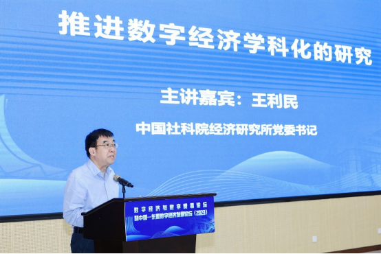 经济研究所党委书记王利民发表题为《推进数字经济科学化的研究》的主题演讲。他指出进行数字经济研究要从学科化的角度来进行,并将数字经济与信息经济学、语言经济学、产业经济学相比较,认为数字经济研究有可能成为一个新兴的学科研究。