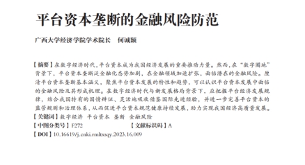 何诚颖教授的论文《平台资本垄断的金融风险防范》正式发表于人民论坛·学术前沿(2023年第16期)。作者分析了数字经济时代平台资本垄断泛金融化的态势,厘清了平台资本垄断基本涵义,聚焦了平台资本发展的特性和趋势,认识了平台资本发展中面临的金融风险及其形成机理,并提出了相关政策建议。