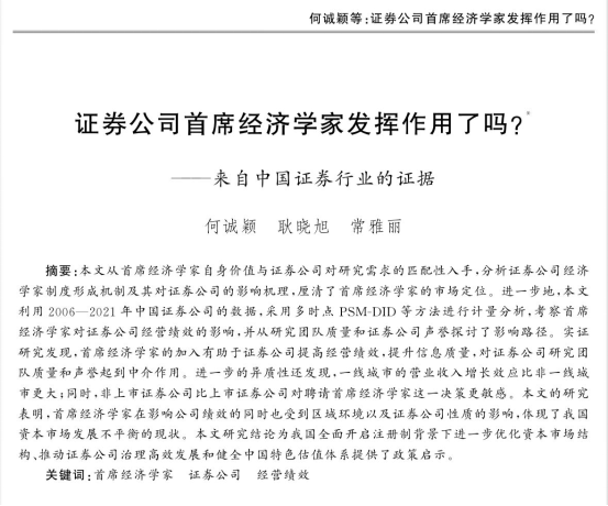 何诚颖教授、常雅丽老师及其合作者广西民族大学讲师耿晓旭博士的论文《证券公司首席经济学家发挥作用了吗》正式发表于经济学动态(2023年第8期)。研究分析了证券公司经济学家制度形成机制及其对证券公司的影响机理,厘清了首席经济学家的市场定位。