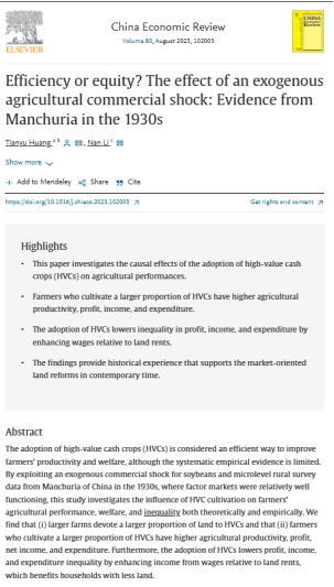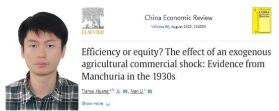 教师黄天宇及其合作者复旦大学李楠教授的论文“Efficiency or equity? The effect of an exogenous agricultural commercial shock: Evidence from Manchuria in the 1930s”(《效率还是平等?农业商业化冲击的效应:来自1930年代中国东北地区的证据》)正式发表于China Economic Review(Volume 80, August 2023)。作者从理论与实证两方面考察了近代大豆贸易冲击对东北地区农户生产效率和福利不平等的影响。