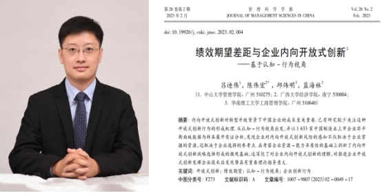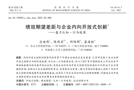 陈伟宏老师与中山大学吕迪伟博士、华南理工大学蓝海林教授及邱炜明博士合作撰写的学术论文《绩效期望差距与企业内向开放式创新——基于认知-行为视角》在《管理科学学报》2023年第2期正式发表。