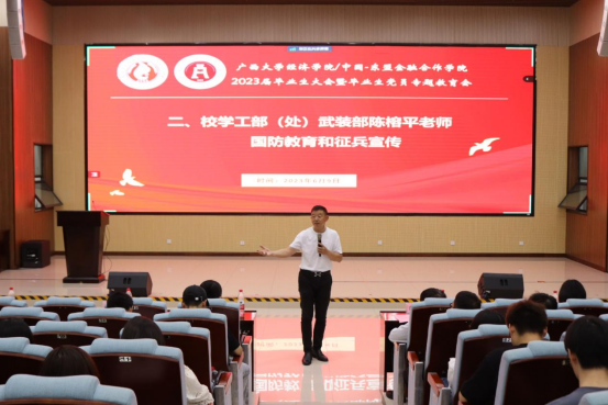 团委书记王海希,团委副书记蒙江勇,辅导员蒙昀、覃晓阳、曾宪友、何湘桂出席本次会议,2023届全体毕业生与会。