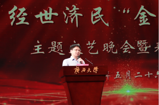党委陆善勇书记为晚会致辞。陆书记向现场师生阐释了“经济”的汉字溯源和涵义演化,希望同学们深刻理解其中蕴含的治理世事安定民生之意,树立远大理想,心怀家国天下,传承红色基因,勇担责任使命,真正践行今晚的主题“经世济民跟党走,‘金’彩青春绽光芒”。