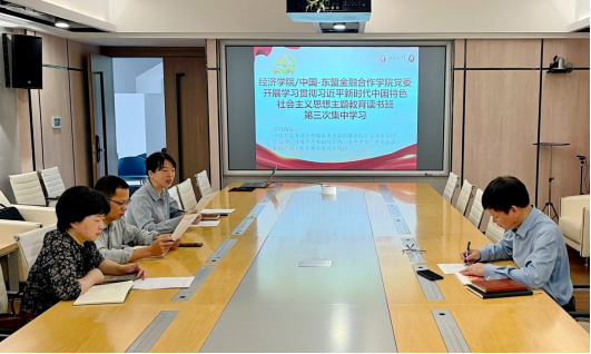 应用经济学学科平台建设情况,就习近平总书记参加党的二十大广西代表团讨论时对广西工作提出的“五个更大”重要要求作学习分享。其他成员紧扣学习主题,联系工作实际,谈学习、谈体会、谈贯彻落实。