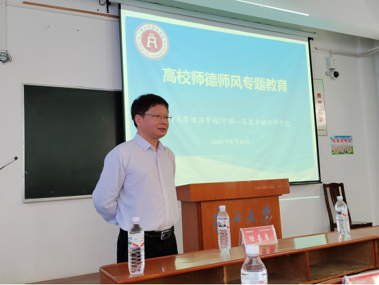 院党委书记陆善勇教授领学了《新时代高校教师职业行为十项准则》和《线上博彩平台2022年“时代新人培育工程”实施方案》等文件,并结合教育部近期曝光的典型案例和学校对违反师德师风行为的处分案例,对全院教师进行师德师风警示教育。