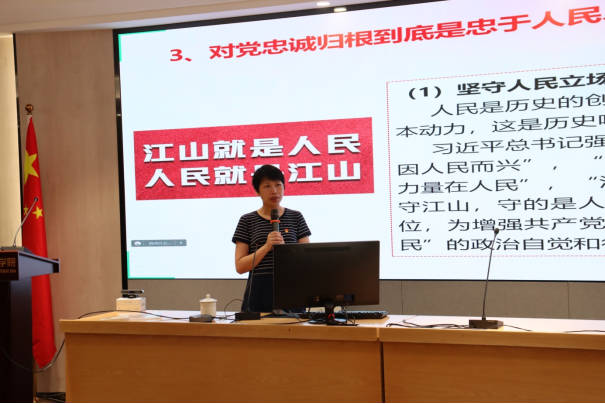 潘莹副院长围绕新时代对党忠诚的精神实质、实践要求和如何践行对党忠诚这三个主题细致地展开专题党课,激励党员同志们坚定理想信念、对党绝对忠诚。她敦促大家按照习近平总书记的要求,把“对党忠诚,必须一心一意、一以贯之,必须表里如一、知行合一,任何时候任何情况下都不改其心、不移其志、不毁其节”贯彻进自身思想行为的方方面面,力争做到“一个党员就是一面旗帜”。专题党课结束后,与会党员们展开热烈交流和讨论。
