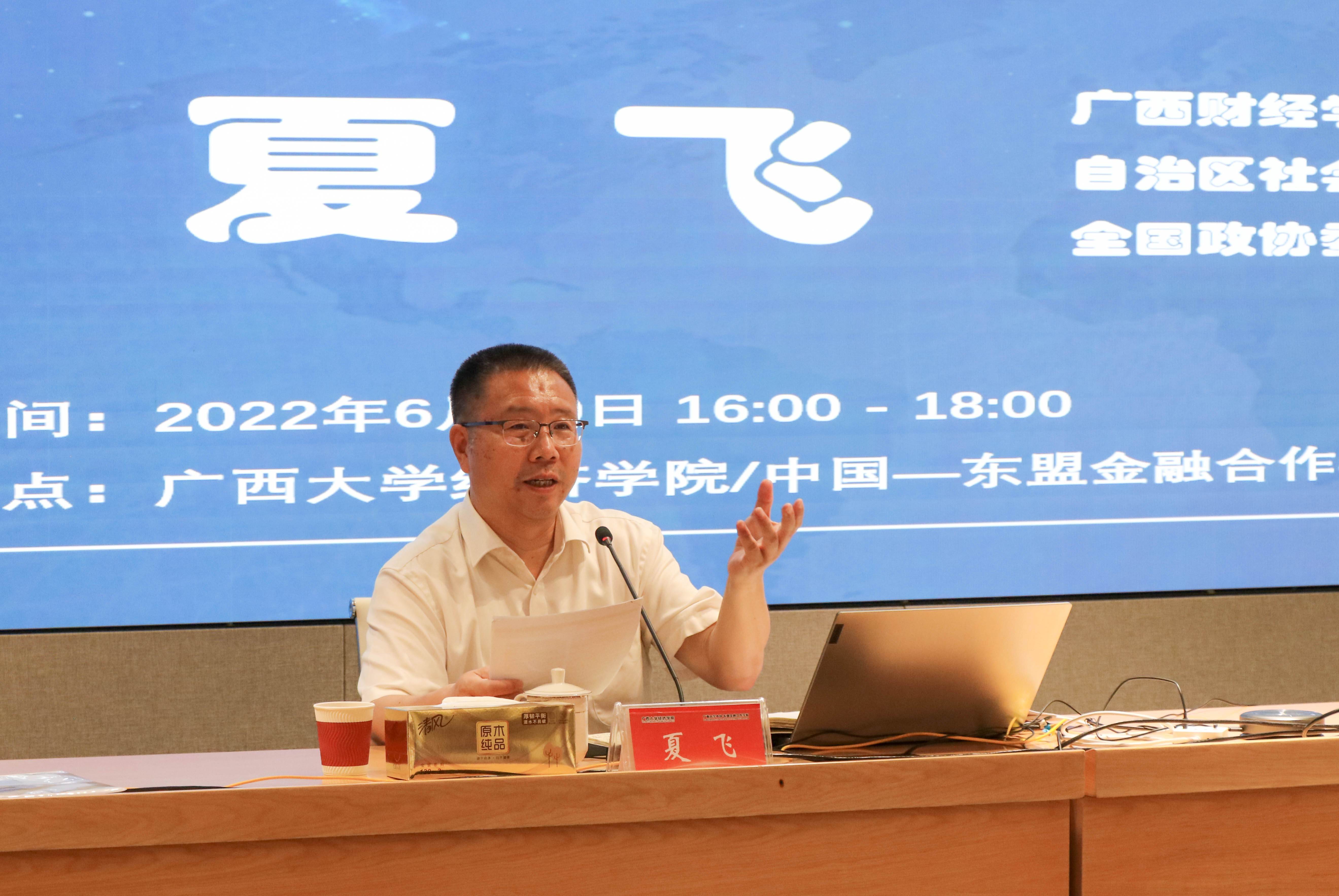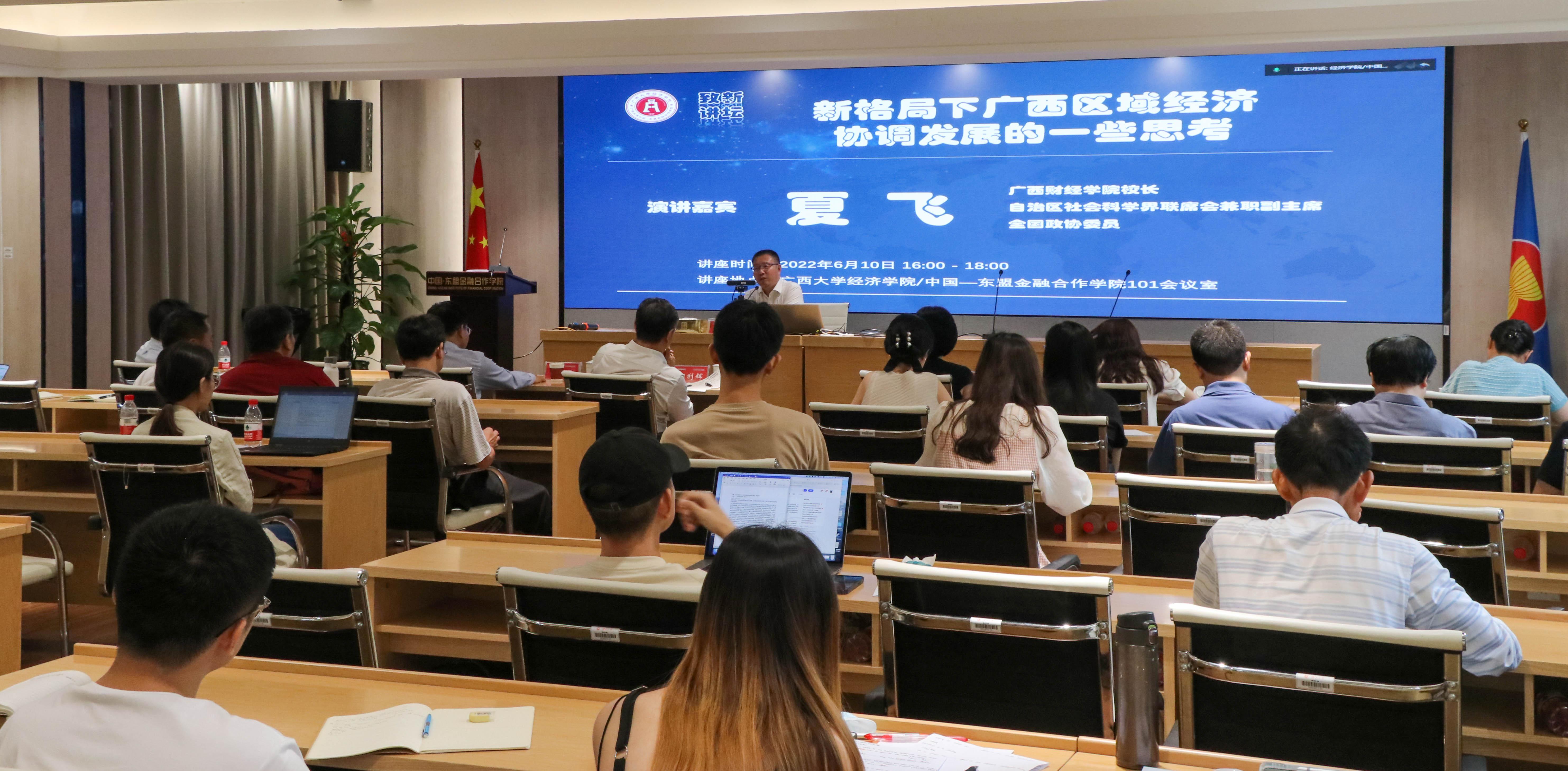夏飞教授以习近平经济思想相关重要论述为引子展开讲座,系统梳理区域经济协调发展理论脉络和内涵,重点阐述广西区域经济协调发展存在的一些问题和解决思路,他通过深刻的理论分析、踏实的实地调研数据及对宏观经济的细致观察和深入思考,从打造核心增长极、制定区域协调发展战略、明晰区域发展重点方向、力促产业优质升级、优化区域产业发展环境等五个方面提出对策建议。