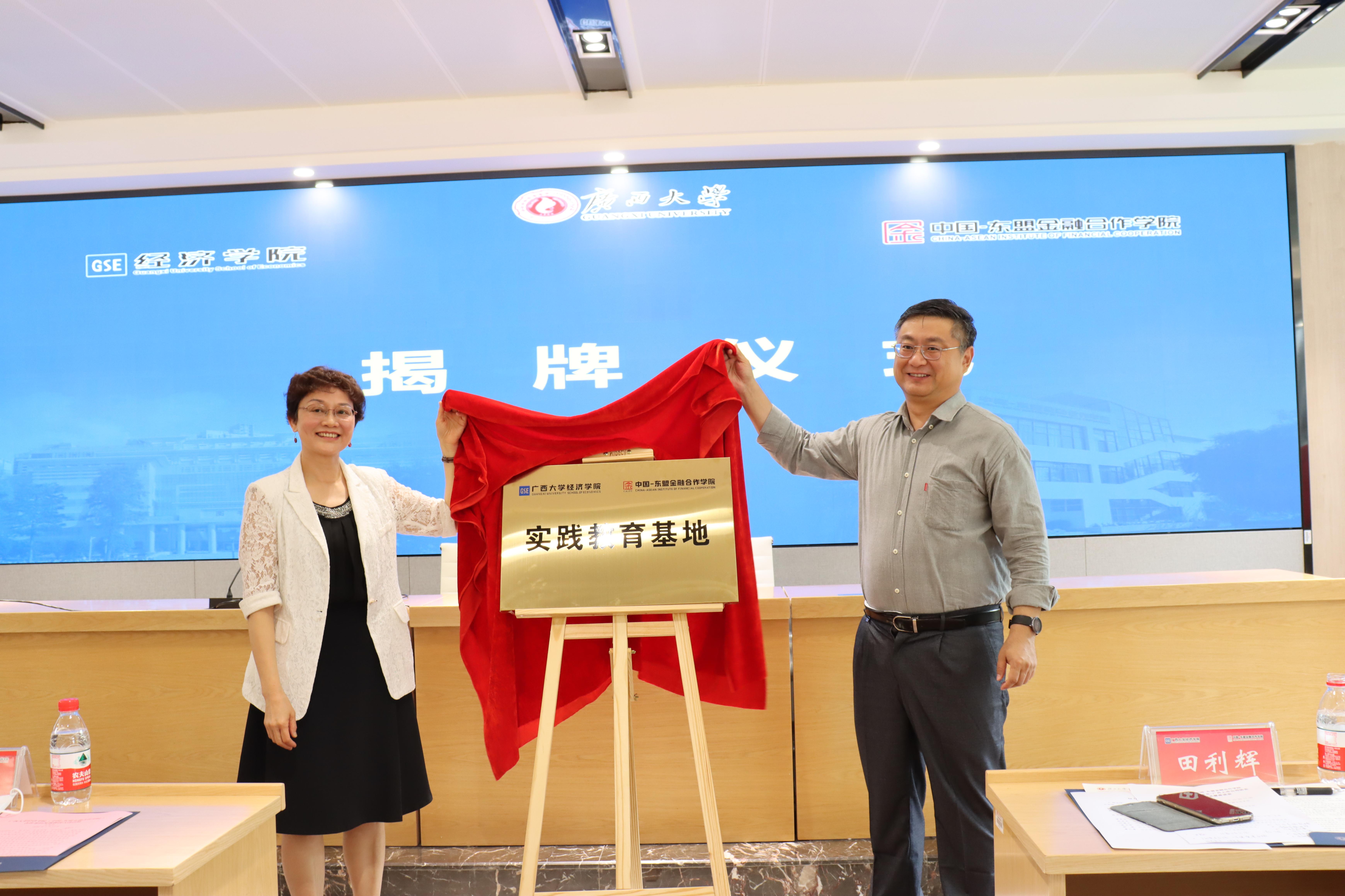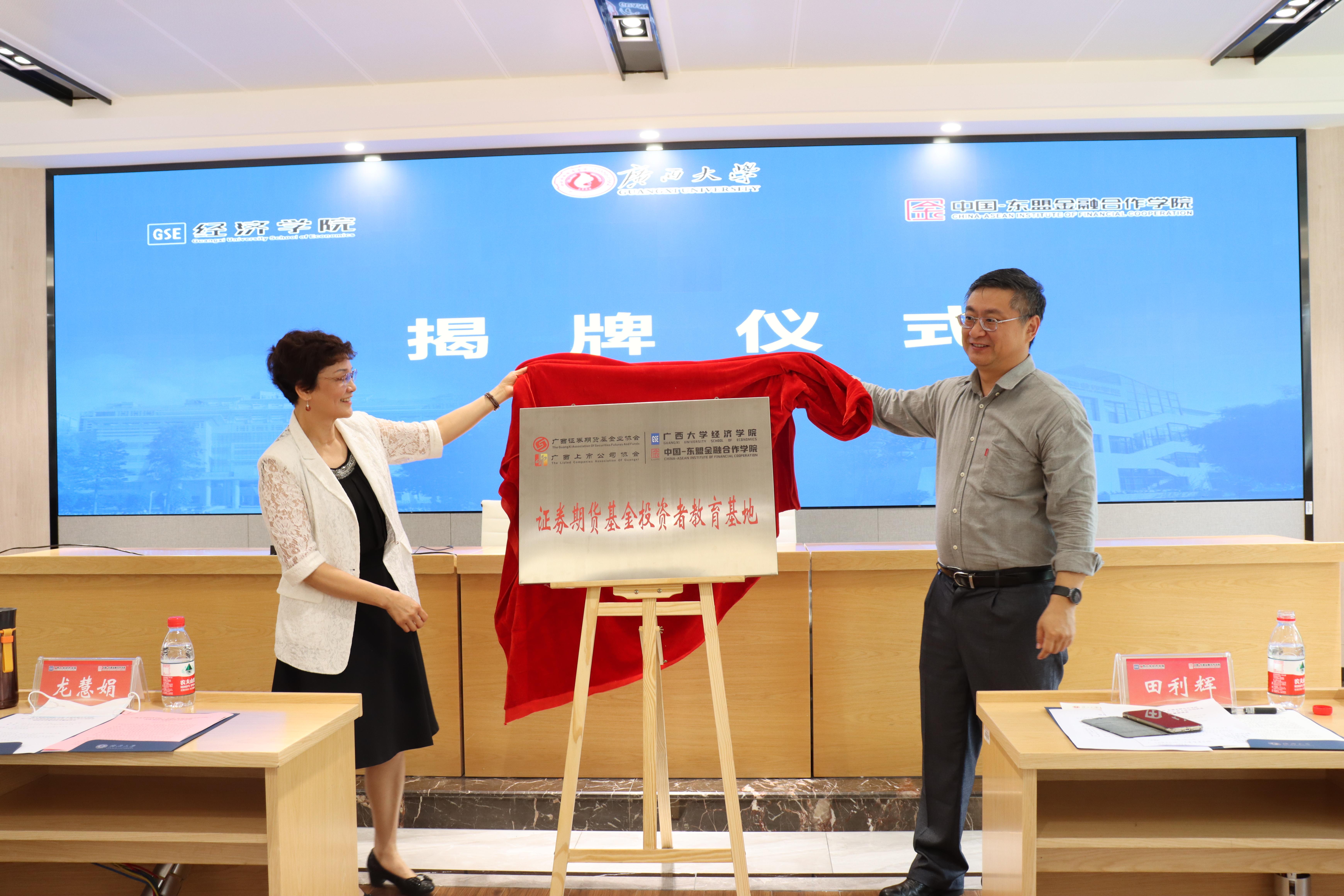 副书记、副院长郭宇路与龙慧娟副会长、广西上市公司协会副秘书长杨芳分别代表双方签署了校企合作协议。田利辉副校长、龙慧娟副会长为“校企合作实习基地”揭牌。
