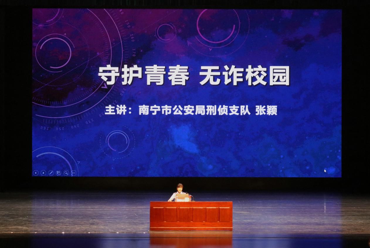 邀请南宁市公安局刑侦支队张颖指导员为全体2022级新生开讲安全教育第一课(防范电信网络诈骗讲座)。