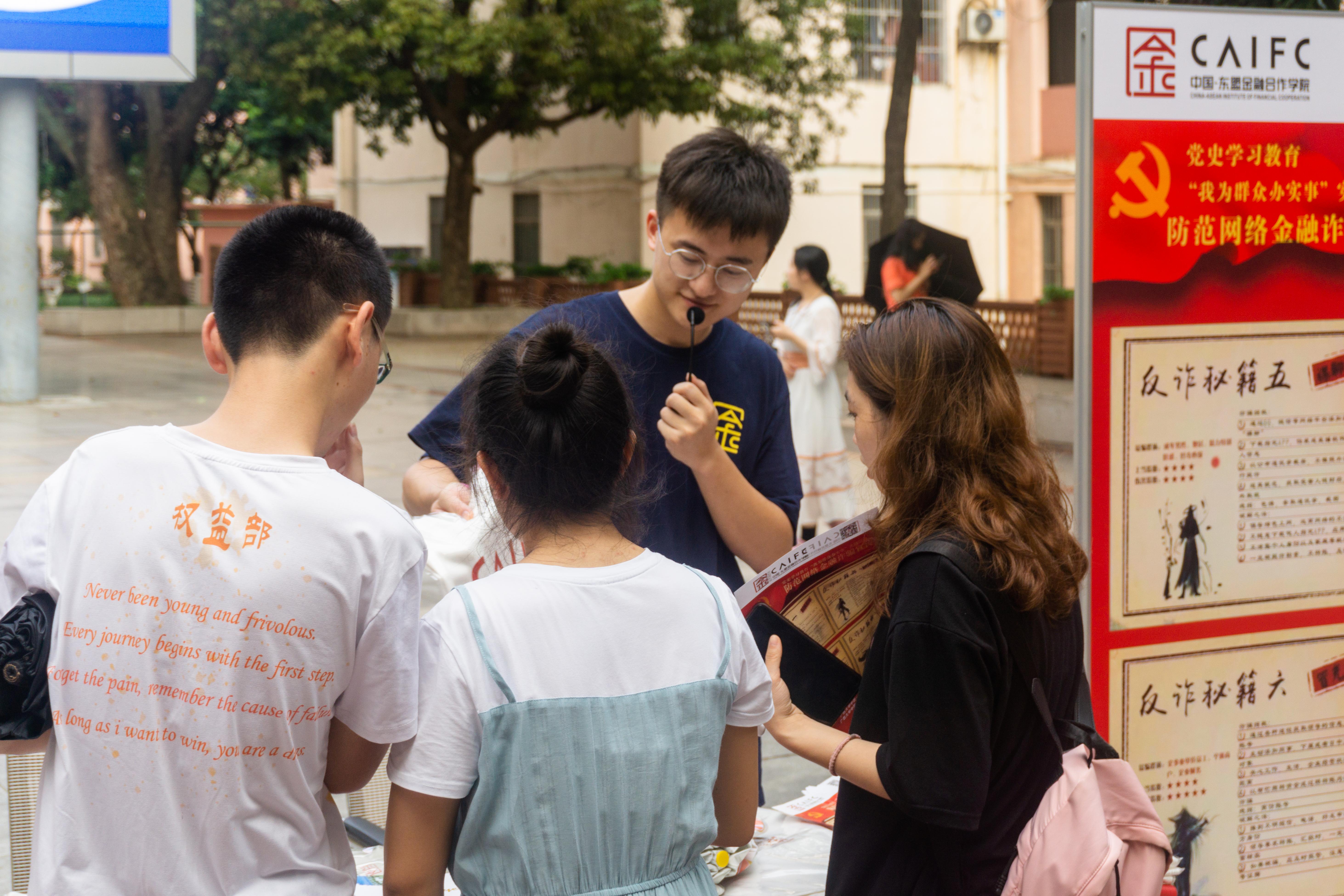 党总支的指导下,东金院学生党支部、研究生会于5月19日下午在线上博彩平台西校园6B广场联合开展了党史学习教育“我为群众办实事”之防范网络金融诈骗宣传活动。