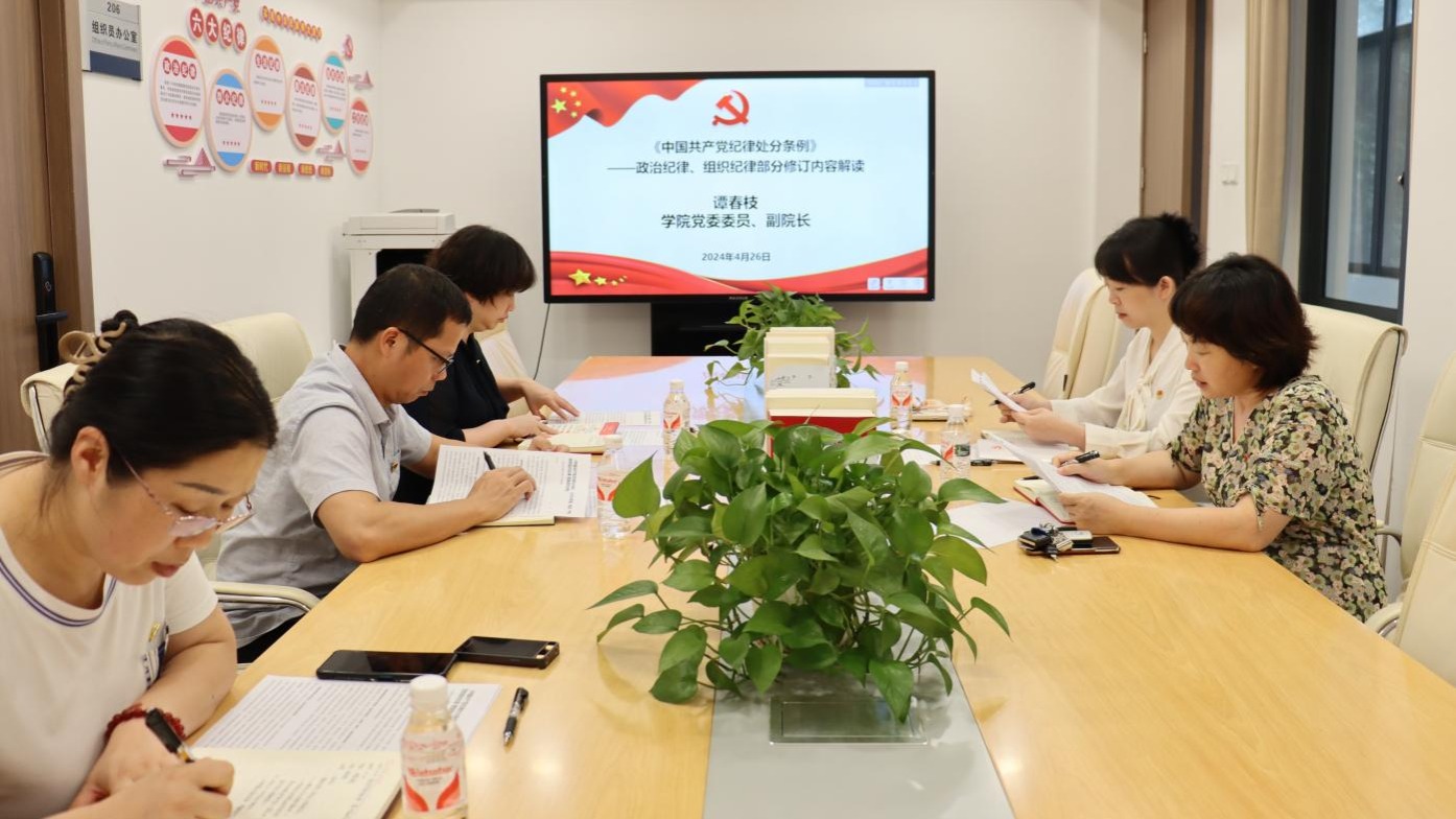 本次学习以党委领导班子成员领学研读、自学心得分享、交流研讨的方式开展,重点学习《中国共产党纪律处分条例》(以下简称《条例》)分则第七章至第十一章及附则的内容。学习会上,院党委纪检委员、副院长谭春枝还分享了两篇关于《条例》(2023年版)部分修订内容的权威解读,加深了党委委员们对所修订内容的认识和理解。