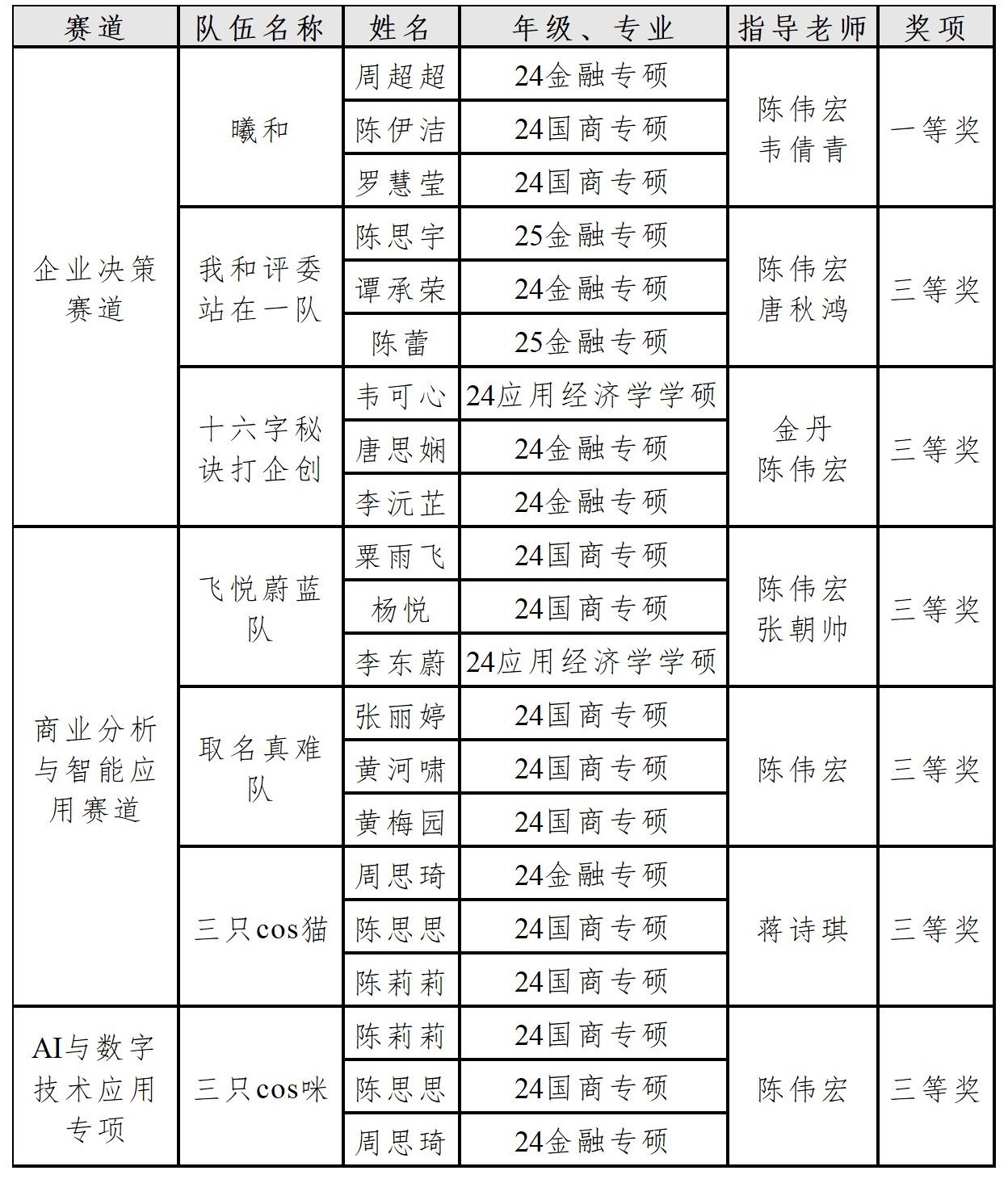 师生积极筹备,再创佳绩,在企创大赛中斩获多项大奖,包括在大赛“企业决策赛道”荣获全国一等奖1项,三等奖2项;“商业分析与智能应用赛道”荣获全国三等奖3项;“AI与数字技术应用专项赛道”荣获全国三等奖1项。此外,线上博彩平台获颁优秀组织奖。其中,由2024级金融专硕周超超、国际商务专硕陈伊洁、罗慧莹三位同学组成的线上博彩平台“曦和”代表队,在大赛全国总决赛企业决策赛道中表现突出,在前期倒数的情况下逆风翻盘取得总决赛小组第一名,问鼎全国一等奖(赛事最高奖项)。
