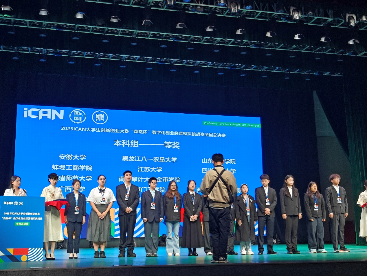 iCAN大学生创新创业大赛由iCAN大学生创新创业大赛组委会主办,2010年获批《教育部、财政部关于批准2010年度大学生竞赛资助项目的通知》大学生竞赛资助项目,2023年入选《全国普通高校大学生竞赛分析报告》竞赛目录(编号54)。本次大赛由iCAN大学生创新创业大赛组织委员会主办,四川师范大学承办,江苏一鼎堂软件科技有限公司等单位协办,以“数字化创业经营模拟”为核心,旨在助力数字经济时代复合型人才培养。大赛吸引了全国31个省、自治区、直辖市的百余所高校参赛,历经初赛、全国总决赛两个阶段,全国总决赛采用线下汇报答辩形式,要求参赛团队聚焦非新能源汽车行业企业的数字化转型需求,结合AI智能体工具平台,设计覆盖生产、供应链、营销、客服等关键环节的创新应用方案。