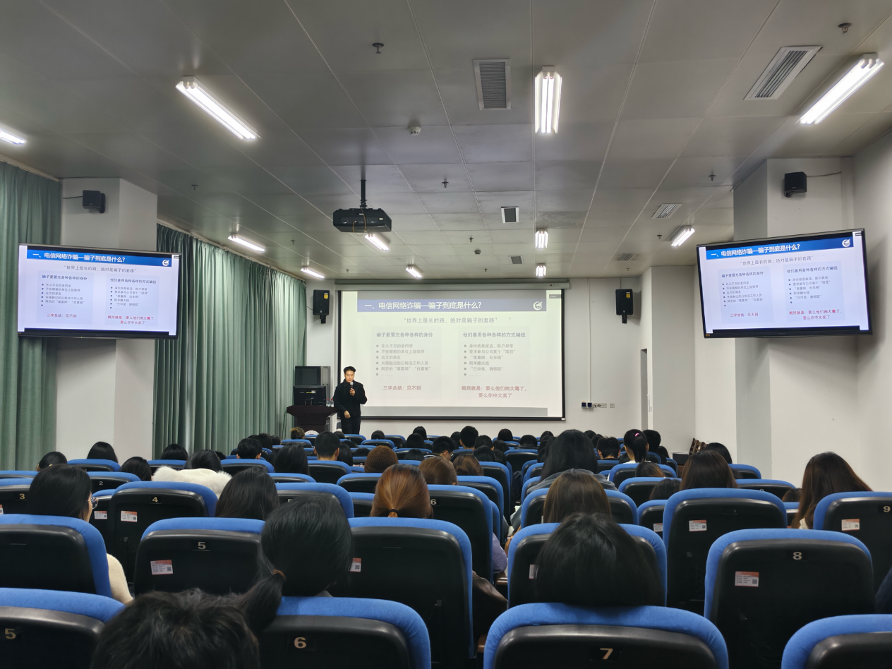 随后,主题宣讲由投资顾问袁兆康主讲。他聚焦“电信网络诈骗、非法校园贷及防范措施”三大维度,结合真实案例,深入剖析诈骗话术与识别技巧,引导学生树立理性金融消费观,提升风险防范能力。袁兆康强调,面对不断升级的诈骗手法,大学生应保持清醒、审慎判断,远离不明链接、非法借贷与虚假投资陷阱,并讲授遭遇诈骗或非法借贷纠纷后的应对策略与法律途径,获得在场同学积极响应。