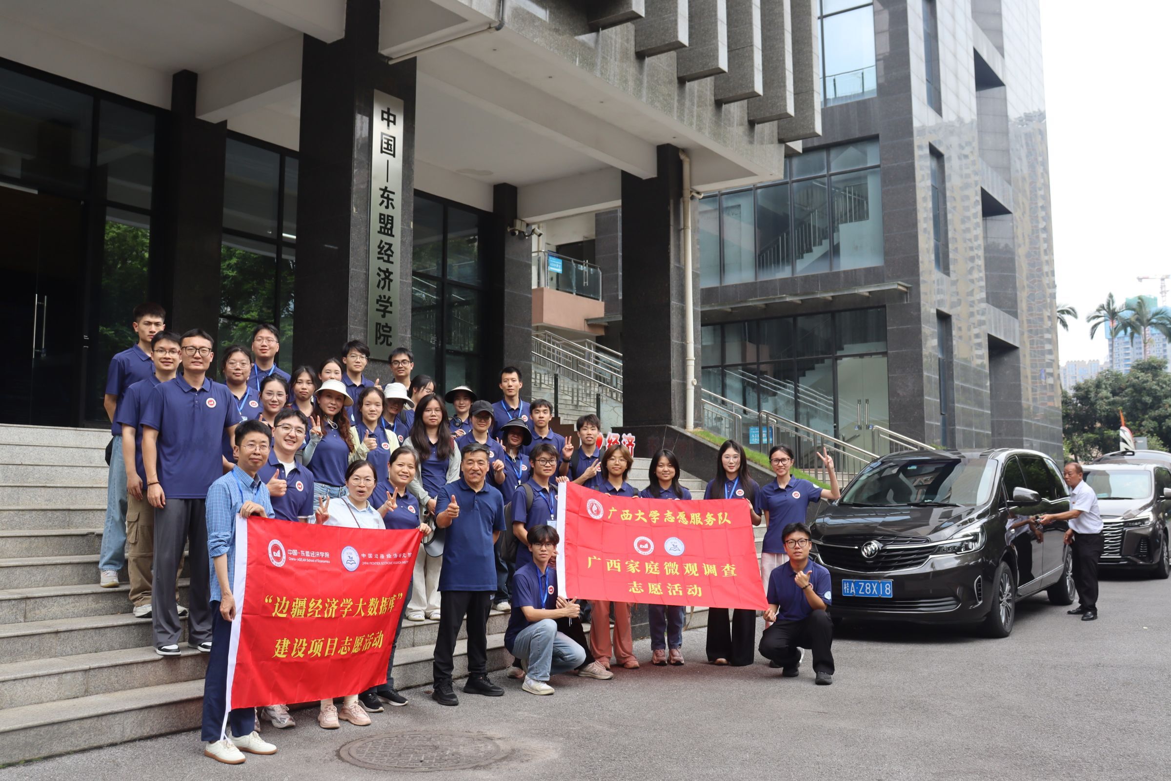 本院坚持“知行合一”的实践育人理念。五年来,累计组织寒暑假社会实践团队30余支,获校级重点项目8项,参与“扬帆计划”“返家乡”“三下乡”等实习实践学生800余人,推荐西部计划志愿者8人,获学校社会实践“优秀单位”荣誉。本院大力弘扬志愿精神,开展边疆经济学数据库建设、中国—东盟博览会和第一届学生(青年)运动会等志愿服务活动,收到中国(广西)自贸区工作办公室、广西国际博览事务局发来感谢信,志愿服务累计时长超3万小时,志愿者人次超3000人。广大青年在实践中深化了对边疆国情与东盟合作需求的认知,锤炼了跨文化沟通与实干能力,真正在服务国家战略、促进区域发展中挺膺担当,实现了专业所学与青春奉献的有机统一。