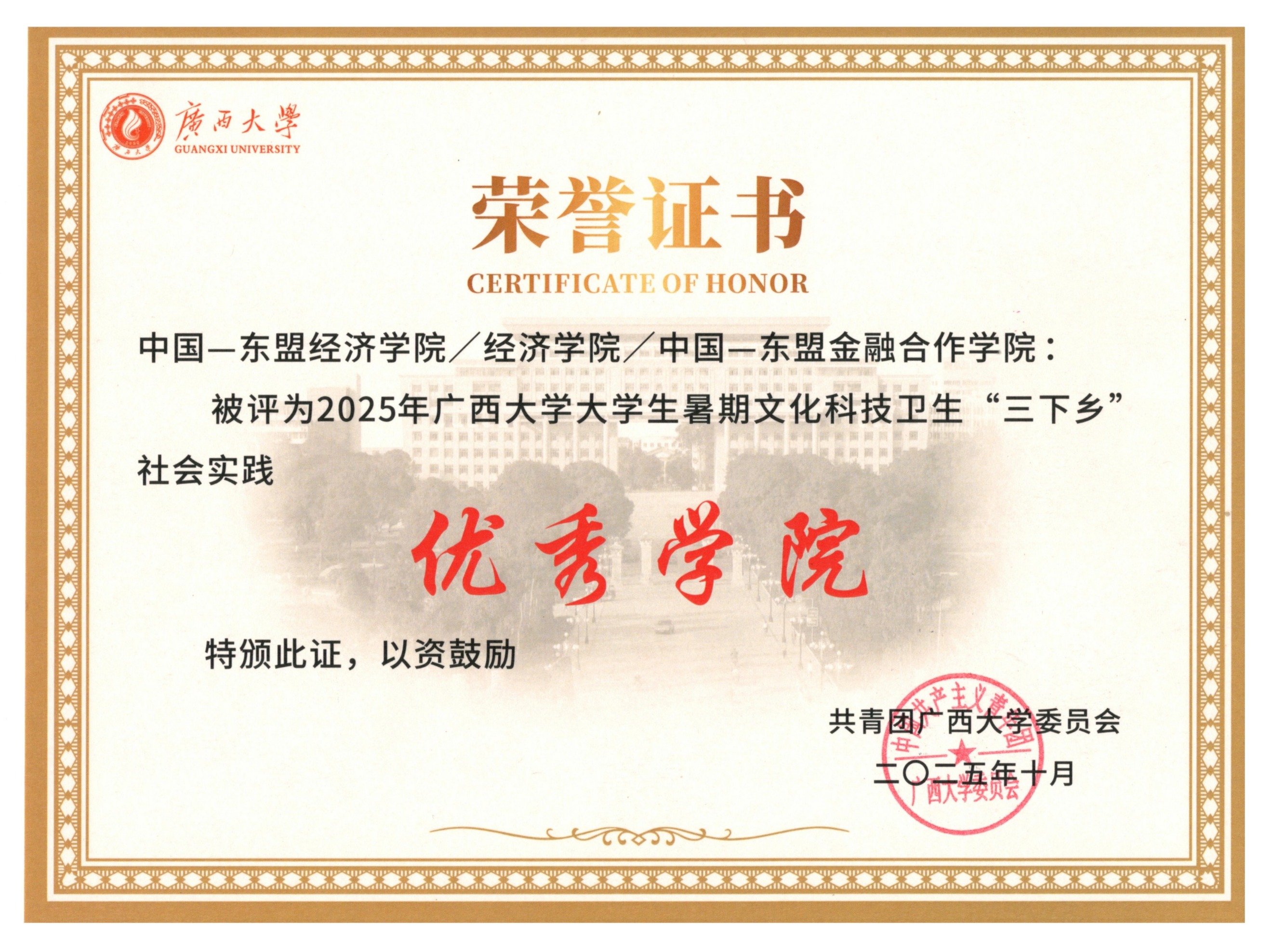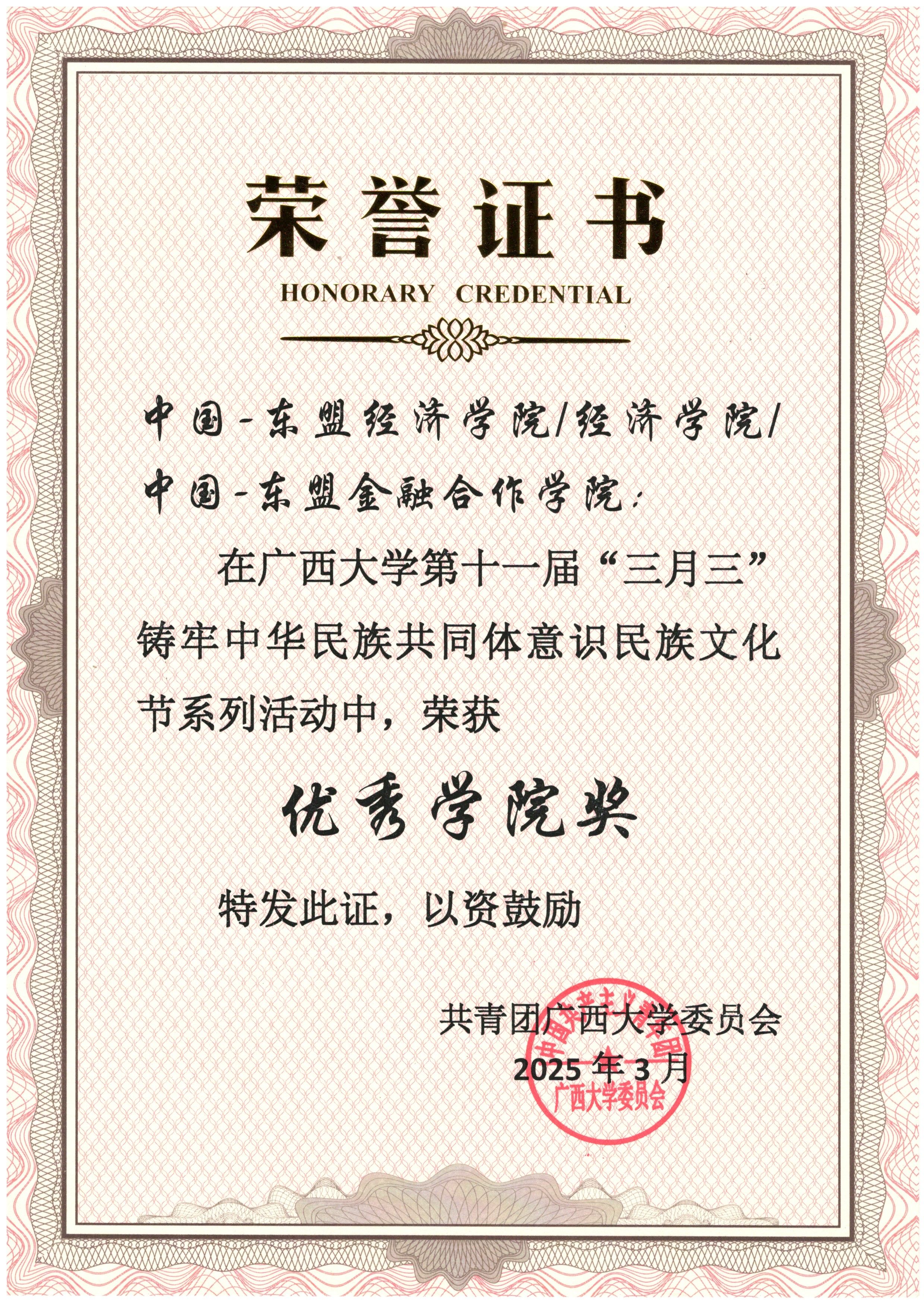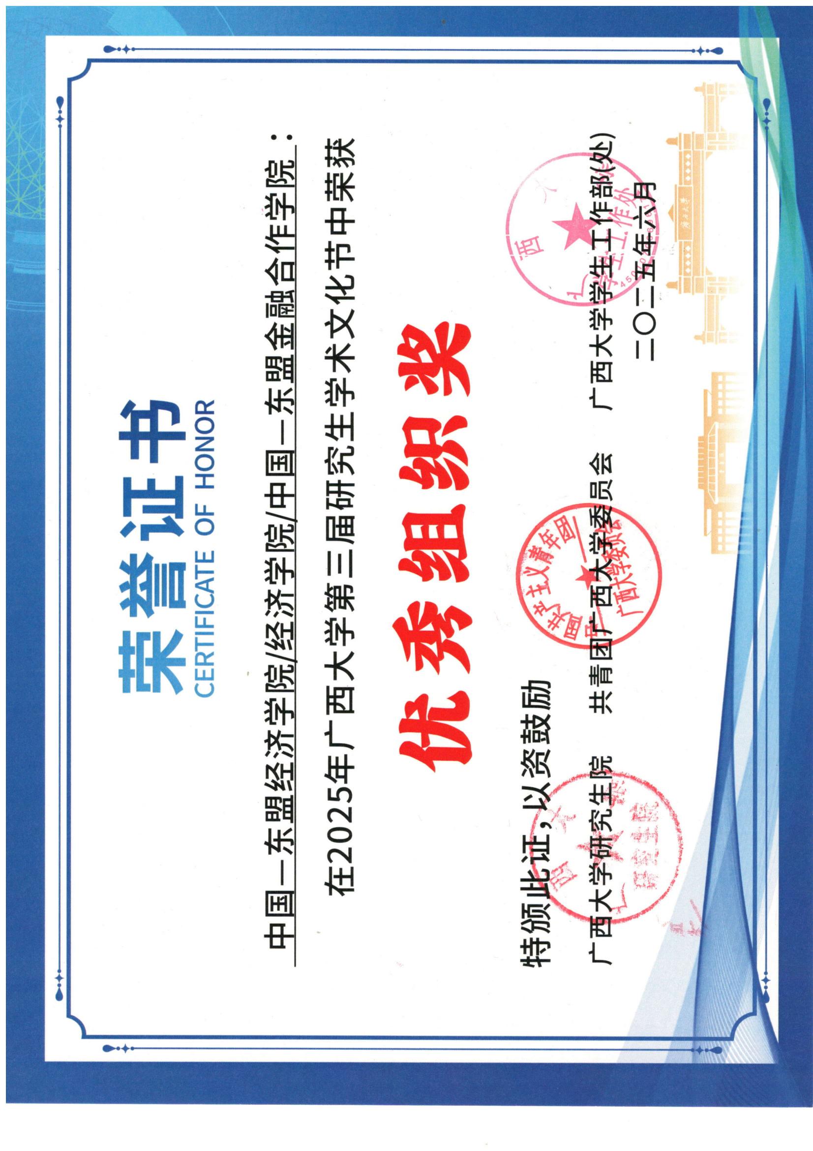 奖;同时,本院连续三年均获学校研究生学术文化节优秀组织奖。近五年,本院累计获评校级五四红旗团支部15个、优秀共青团干部75人、优秀共青团员130人,向上向善·好青年15人。这些鲜活榜样与丰硕成果,彰显了本院育人工作的扎实成效,激励着广大青年在服务边疆发展、面向东盟合作的新征程中共同进步。