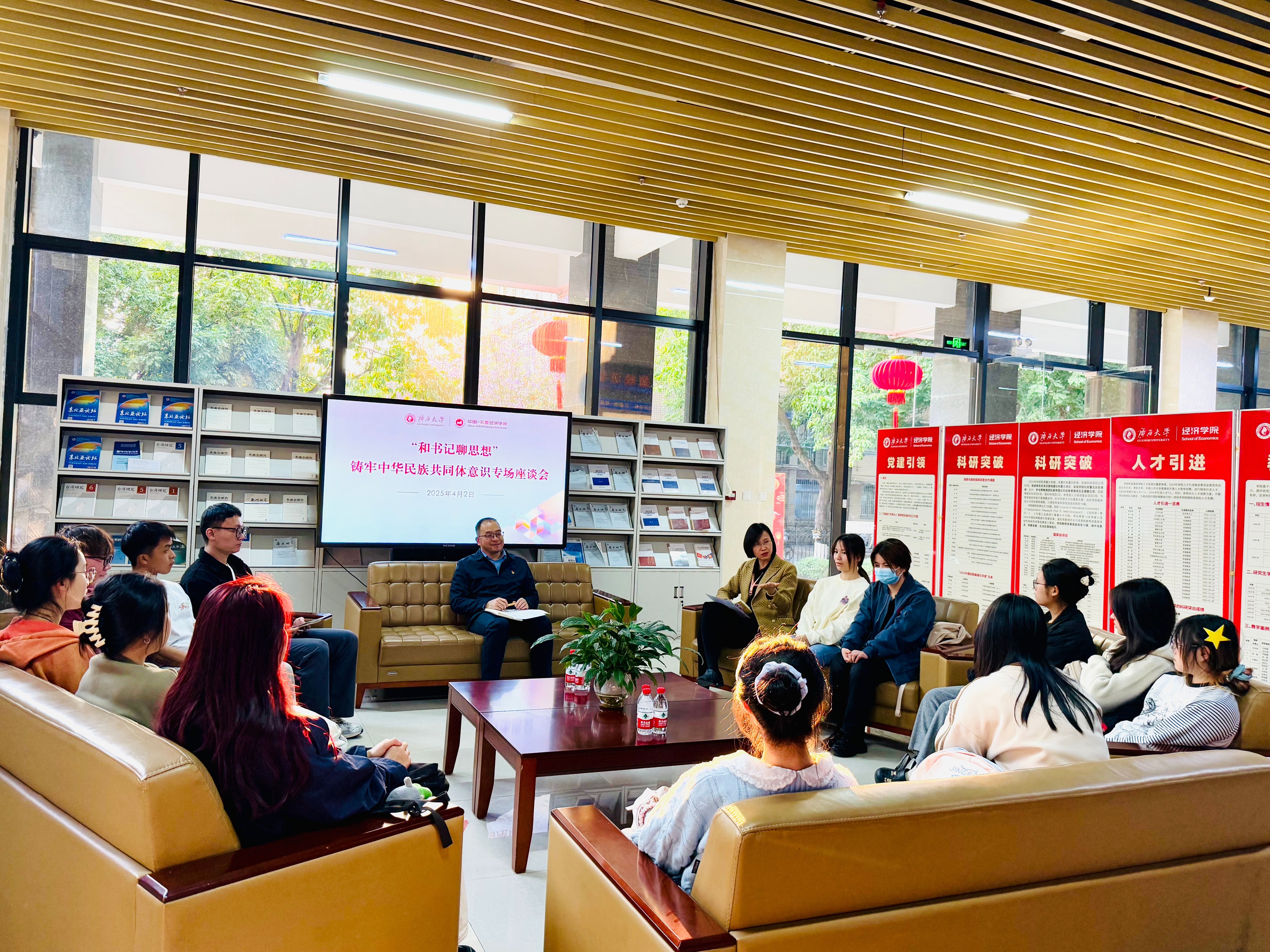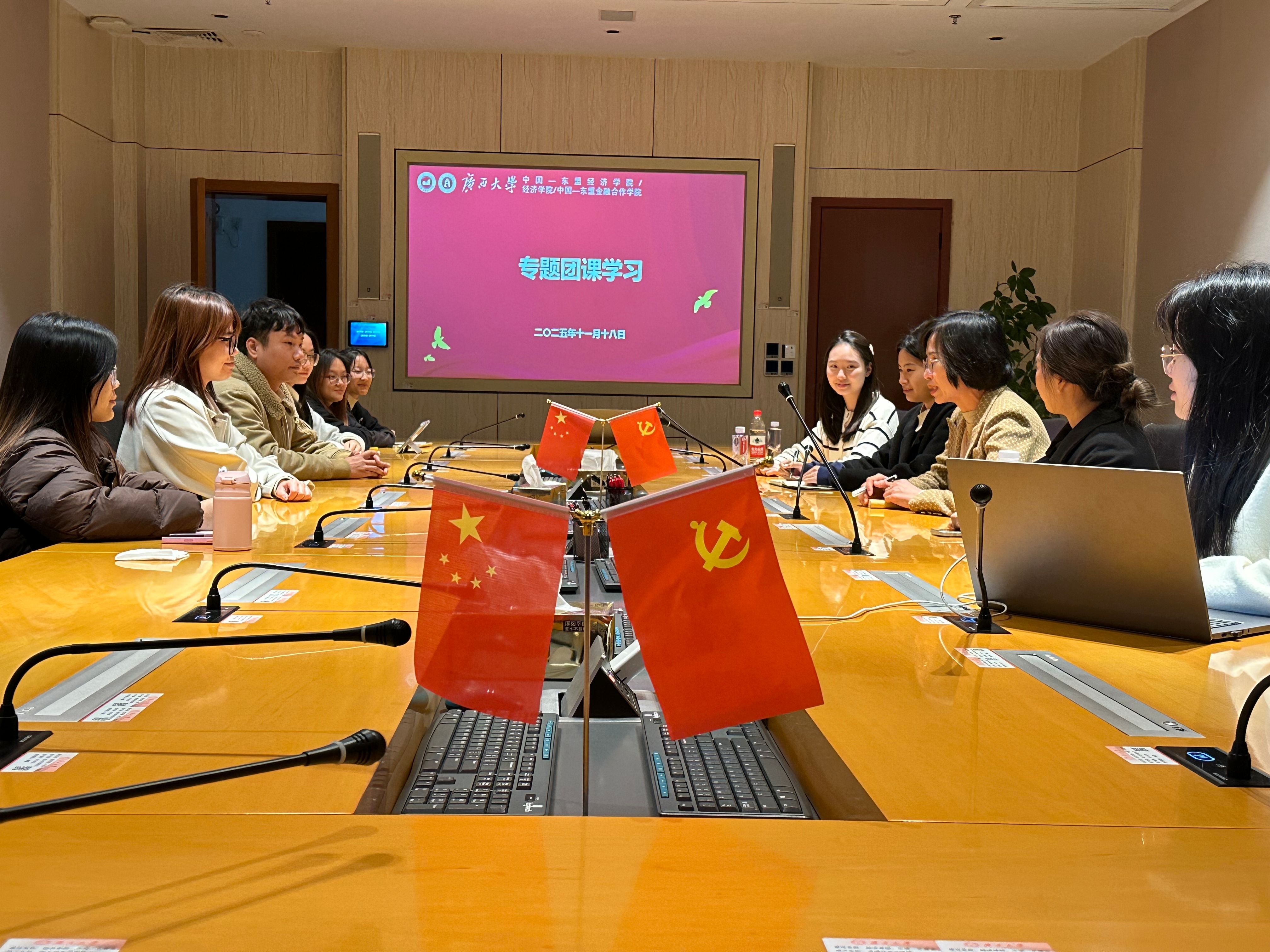 成立仪式和挂牌仪式、第22届中国—东盟博览会“2025年中国—东盟经贸合作对话活动”、“五四”青年表彰等重大活动并发表讲话,为青年成长把舵定向。上级专题听取工作汇报,对实践基地建设、青年人才培养、校友资源整合等领域作出具体指示;建立常态化的“师生面对面”交流机制,通过“和书记聊思想”和学生骨干培训等形式,积极回应青年成长成才的核心关切。这些精准的指引与深切的关怀,为本院团学工作注入了强大的发展动力,引领青年在推进中国式现代化、服务中国—东盟命运共同体和新时代壮美广西建设中挺膺担当。