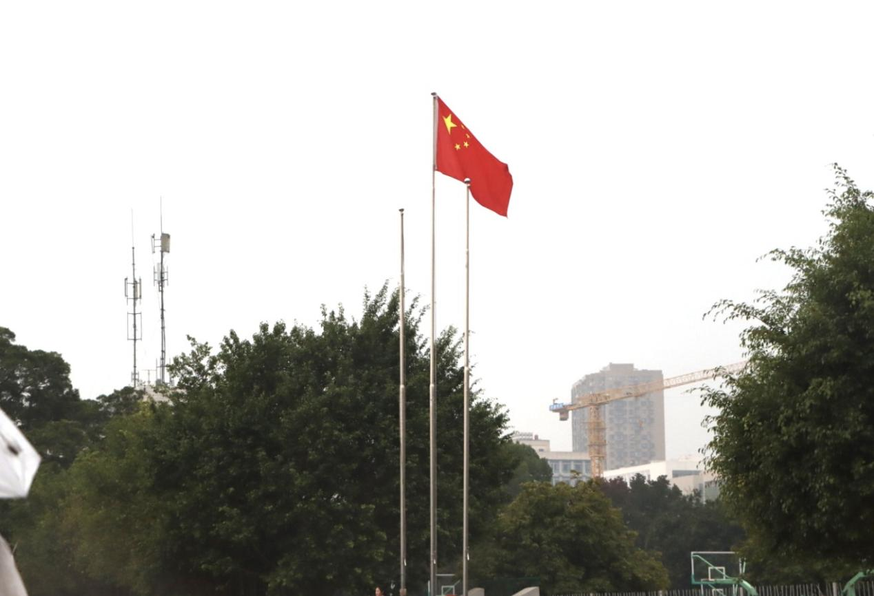 师生代表身着整齐服装,以抖擞的精神、昂扬的姿态列队集合。清晨的细雨突如其来,却丝毫没有冲淡大家的热情,师生们神情庄重肃穆,目光炽热坚定,静静伫立在雨幕中,等候这一神圣时刻的到来。静默肃立间,饱含着对过往一年的总结回望,更寄托着对新年的美好期许,风雨无阻的坚守里,是全体师生对祖国最深沉的祝福与最崇高的敬仰。
