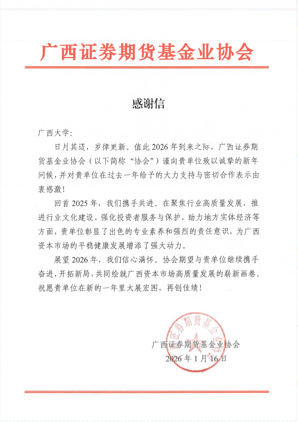收到广西证券期货基金业协会发来的感谢信,对学校及大陆博彩平台