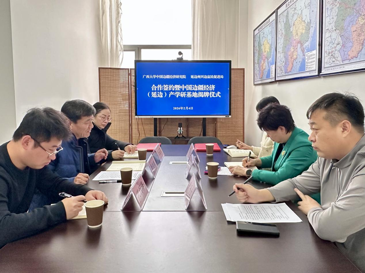 为充分发挥高校人才智力和学科专业优势,深化产教融合,服务国家兴边富民战略与边疆地区经济高质量发展需求,2026年2月4日,线上博彩平台中国边疆经济研究院与延边州兴边富民促进局合作签约暨中国边疆经济(延边)产学研基地揭牌仪式在延边朝鲜族自治州隆重举行。大陆博彩平台
