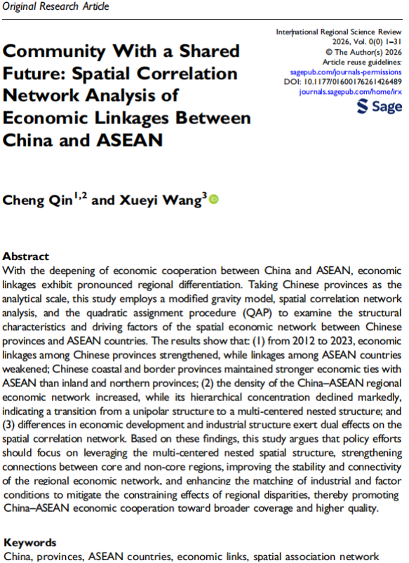 教师覃诚作为第一作者与其合作者共同完成的学术论文“Community with a Shared Future: Spatial Correlation Network Analysis of Economic Linkages between China and ASEAN”(《命运共同体:中国—东盟经济联系的空间关联网络分析》)在《International Regional Science Review》发表。该研究得到广西高校人文社会科学重点研究基地中国—东盟区域发展协同创新中心基金项目、线上博彩平台大陆博彩平台-线上博彩平台