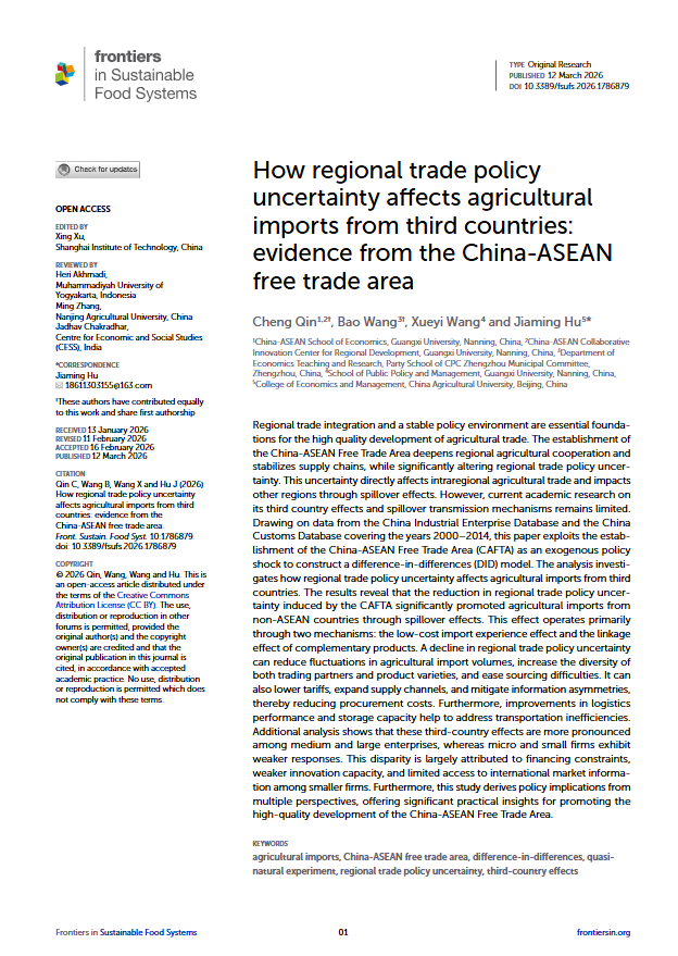 教师覃诚作为共同第一作者,与合作者共同完成的学术论文 “How regional trade policy uncertainty affects agricultural imports from third countries: evidence from the China-ASEAN free trade area”(《区域贸易政策不确定性如何影响自第三方国家的农产品进口——来自中国-东盟自由贸易区的经验证据》)在《Frontiers in Sustainable Food Systems》正式发表。该研究得到广西高校人文社会科学重点研究基地中国—东盟区域发展协同创新中心基金项目(CWYB202405)、线上博彩平台大陆博彩平台