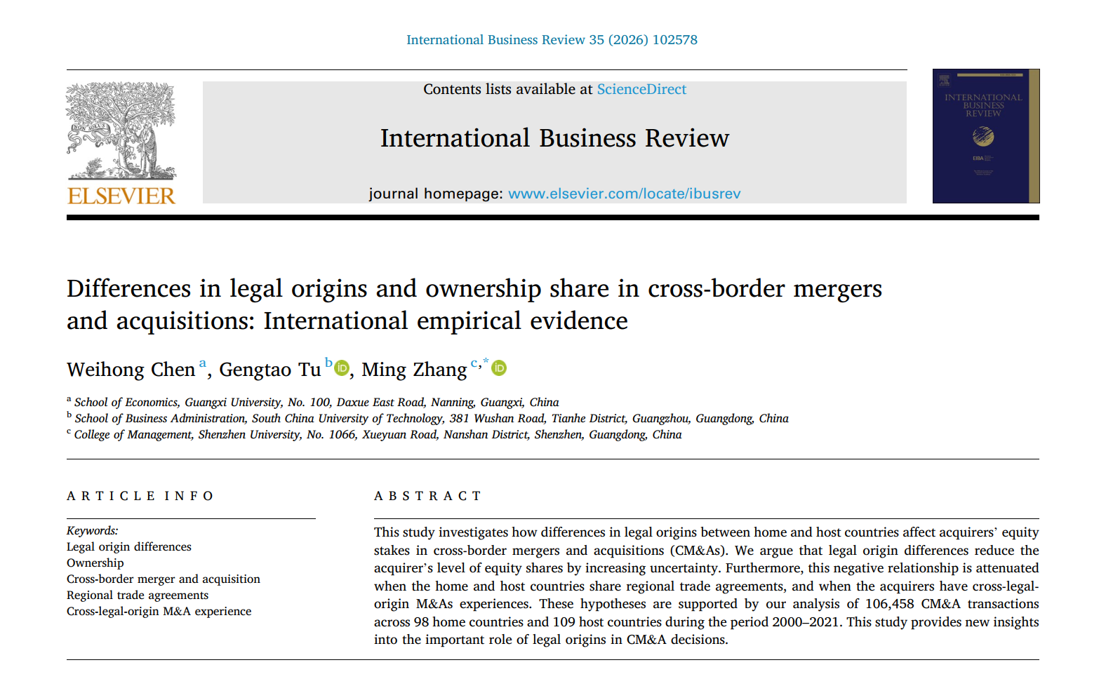 陈伟宏副教授与2022级应用经济学专业(国际贸易方向)硕士研究生涂耿滔以及深圳大学张明副教授合作的论文“Differences in legal origins and ownership share in cross-border mergers and acquisitions: International empirical evidence”在《International Business Review》期刊2026年第4期正式出版。陈伟宏副教授为论文第一作者,张明副教授为论文通讯作者。